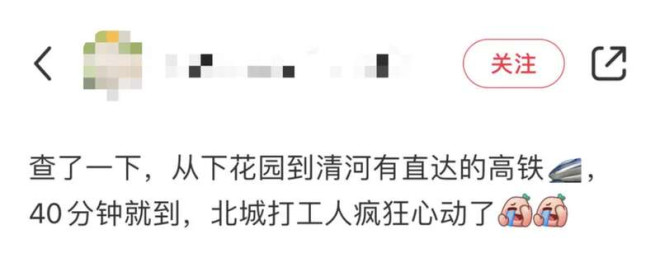 从下花园到北京,每天有超20班高铁直达。以新闻中提到的“马车社住宅楼”为例,坐高铁到海淀区的清河站,然后再转地铁去上班,理论上通勤时间甚至能控制在60分钟左右。