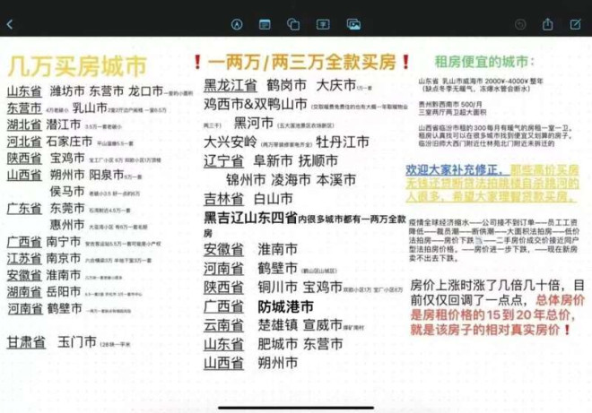 需要注意的是,有些地方的“白菜房”价格已经被炒高了,虽然只是从两三万炒到五万。有想法的人,还得早做准备。