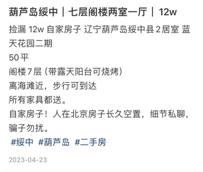 辽宁绥中的一套两居室,带露天阳台可以烧烤,步行能走到海滩,业主还送所有家具,总价只要12万!